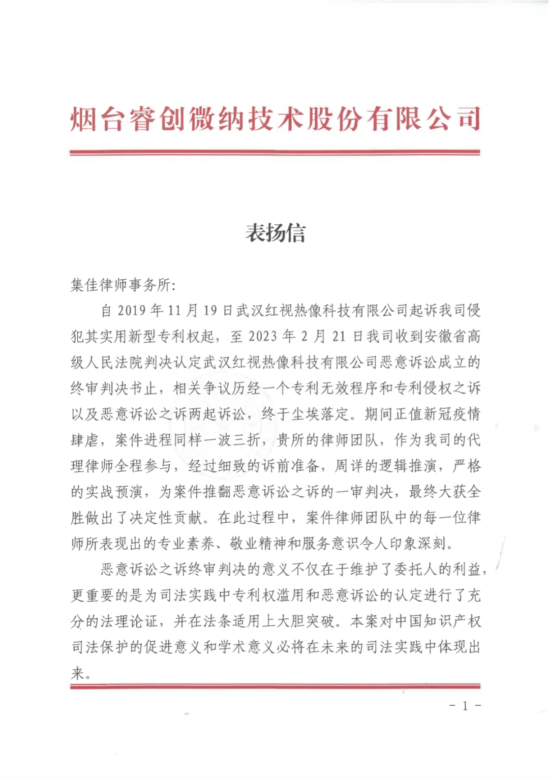 2023年2月10日,安徽省高级人民法院就烟台睿创微纳技术股份有限公司、烟台艾睿光电科技有限公司、安徽英睿系统技术有限公司等(下称“睿创集团”)与武汉红视热像科技有限公司(下称“武汉红视”)因恶意提起知识产权诉讼损害责任纠纷一案作出终审判决,认定武汉红视滥用诉权的行为构成恶意诉讼,并判令其赔偿睿创集团相应的合理支出。至此,时隔四年,横跨疫情时代的专利侵权及恶意诉讼系列纠纷案,终于尘埃落定。海星体育直播协助睿创集团最终取得系列案件的全面胜利,维护了客户合法权益,实现了商业竞争的公平正义!