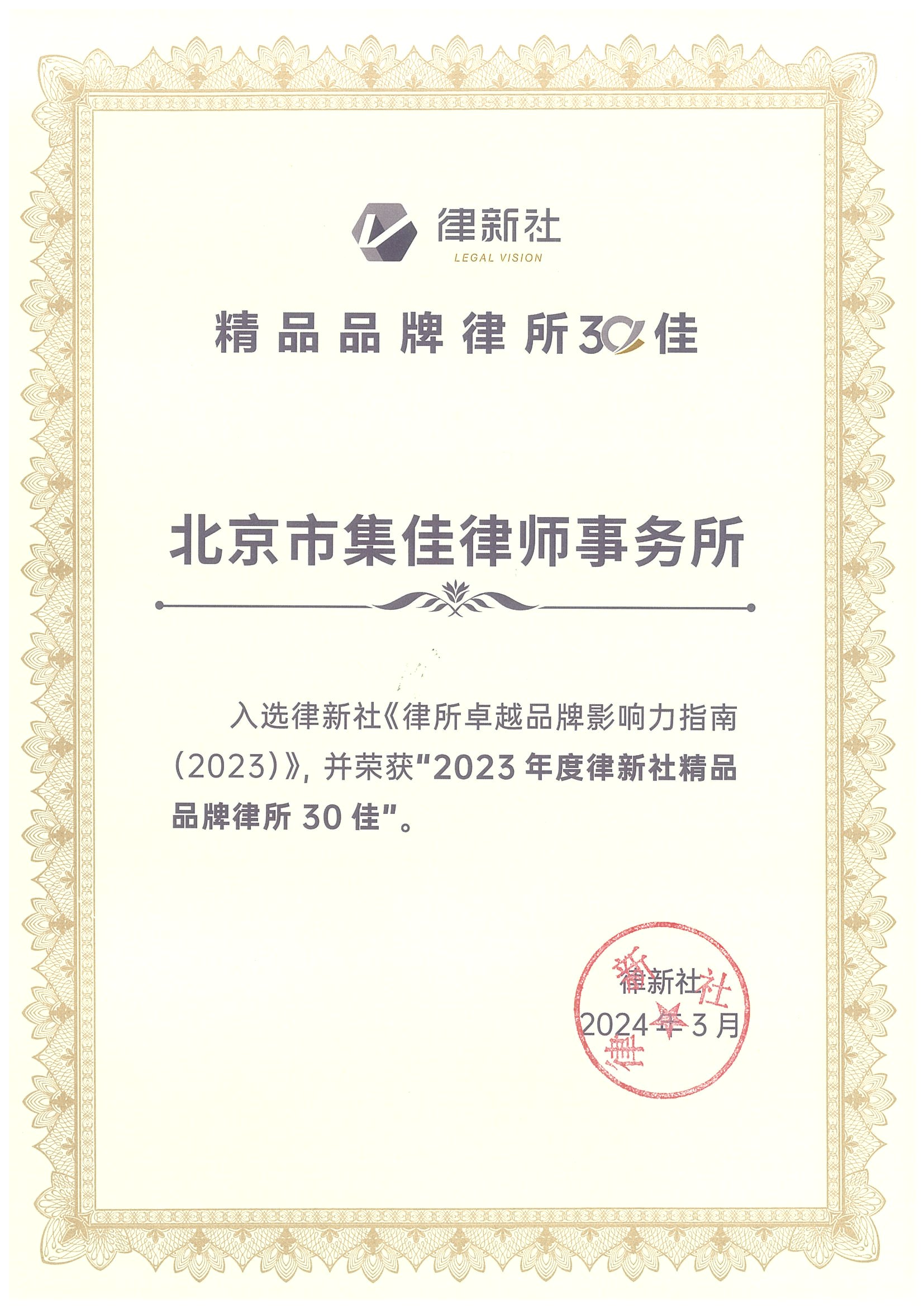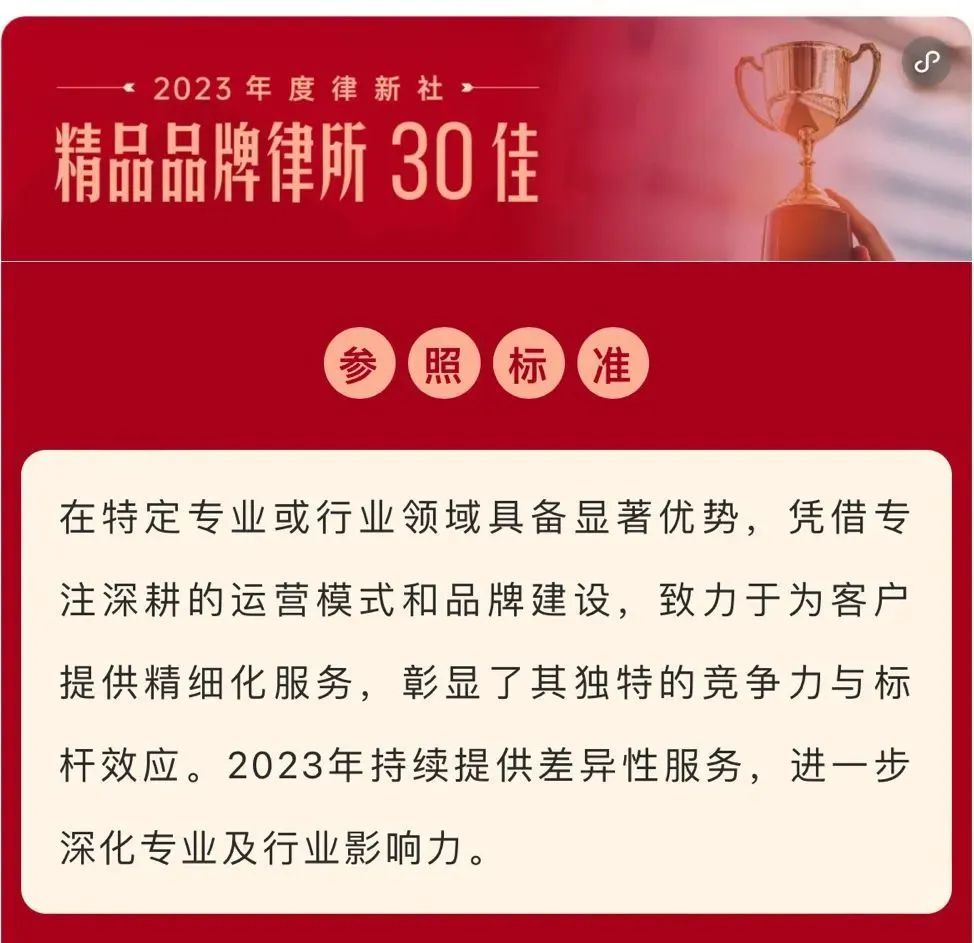 2024年3月2日,由中国法学交流基金会指导、律新社主办的“致·追光者”第二届法律服务业品牌发展论坛暨律新社2023年度品牌盛典隆重举行,现场发布了备受关注的《律所卓越品牌影响力指南(2023)》,海星体育直播凭借在知识产权领域的卓越实力和良好口碑,荣登“2023年度律新社精品品牌律所30佳”榜单。