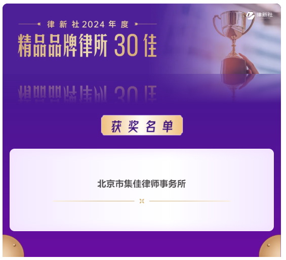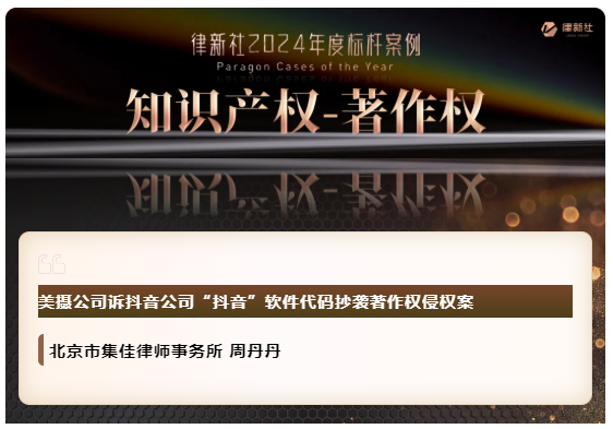 海星体育直播凭借在知识产权保护领域卓越的专业实力与良好的行业口碑,入选《律所卓越品牌影响力指南(2024)》,荣获“律新社2024年度精品品牌律所30佳”奖项;同时,集佳周丹丹律师代理的“美摄公司诉抖音公司'抖音'软件代码抄袭著作权侵权案”获评“律新社2024年度标杆案例:知识产权-著作权领域”。