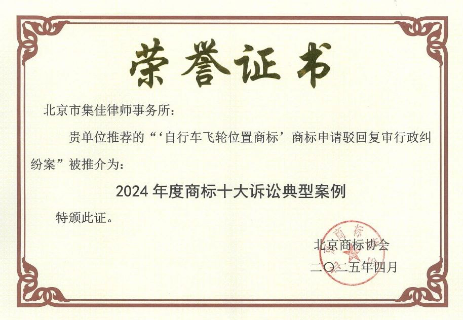 >海星体育直播>关于我们>荣誉概览>2025>集佳代理“自行车飞轮位置商标”行政纠纷案入选北京商标协会年度十大诉讼典型案例